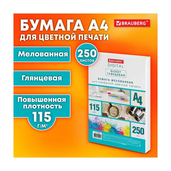 Бумага BRAUBERG DIGITAL GLOSSY мелованная глянцевая А4, 115 г/м2, 250 л., для полноцветной лазерной печати, 120% (CIE), 116401