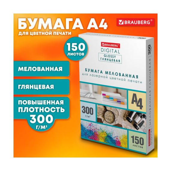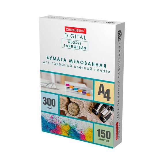 Бумага BRAUBERG DIGITAL GLOSSY мелованная глянцевая А4, 300 г/м2, 150 л., для полноцветной лазерной печати, 116567