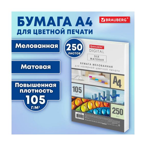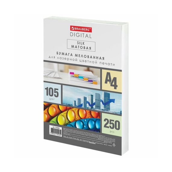 Бумага BRAUBERG DIGITAL SILK, мелованная, матовая, А4, 105 г/м, 250 л., для полноцветной лазерной печати, 130% (CIE),116394