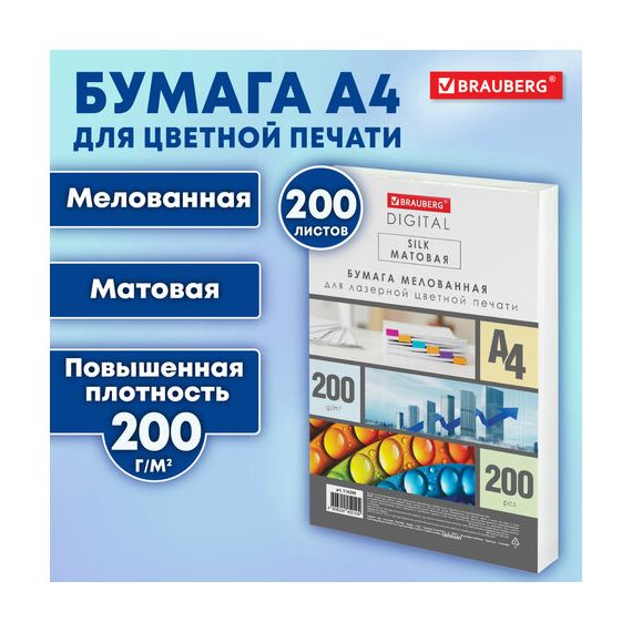 Бумага BRAUBERG DIGITAL SILK, мелованная, матовая, А4, 200 г/м, 200 л., для полноцветной лазерной печати, 130% (CIE), 116399