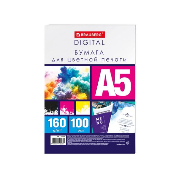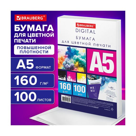 Бумага для цветной лазерной печати А5, ПЛОТНАЯ 160 г/м2, 100 л., BRAUBERG DIGITAL, 145% (CIE), 116408