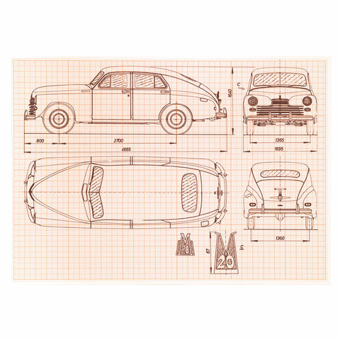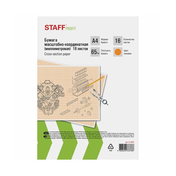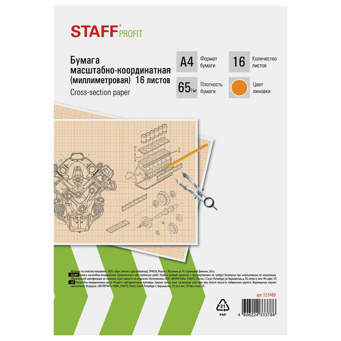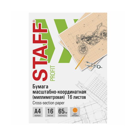 Бумага формата А4 (210х297 мм) и плотностью 65 г/м2 на скобе, 16 листов. Цвет линовки - оранжевый. Отличается четкими линиями и точной миллиметровой разметкой.