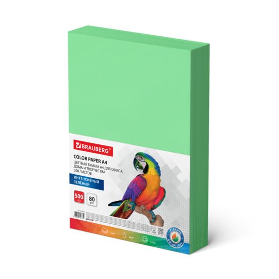 Бумага цветная BRAUBERG, А4, 80 г/м2, 500 л., интенсив, зеленая, для офисной техники