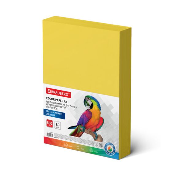 Бумага цветная BRAUBERG, А4, 80 г/м2, 500 л., интенсив, желтая, для офисной техники