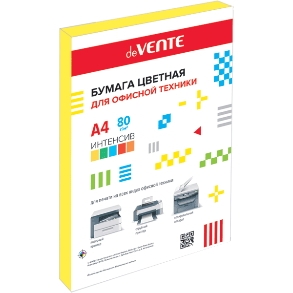 Бумага цветная для офисной техники "deVENTE" A4 100 л, 80 г/м², интенсив желтый, картонная подложка, в термоусадочной пленке