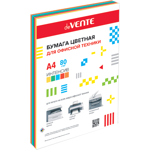 Бумага цветная для офисной техники "deVENTE" A4 100 л, 80 г/м², интенсивные цвета, ассорти (5 цветов) картонная подложка, в термоусадочной пленке