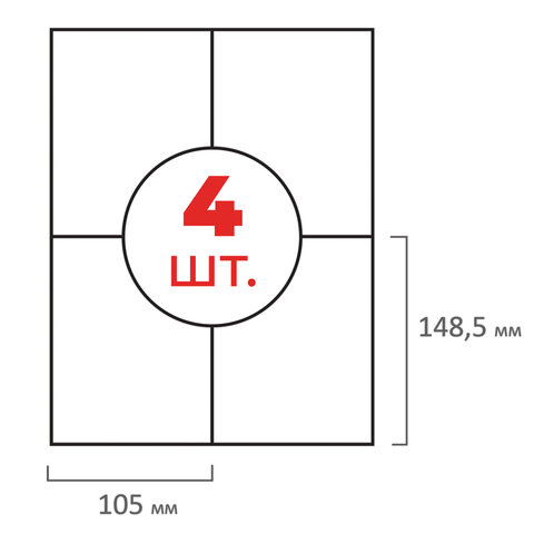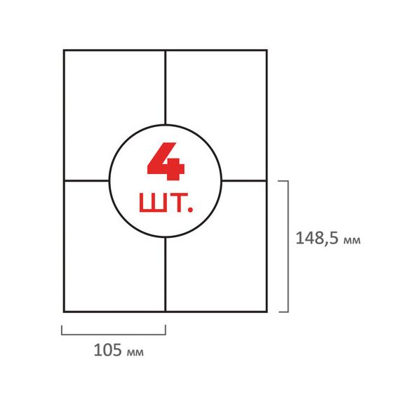 Изготовлены из матовой бумаги белого цвета плотностью 70 г/м2. Картонная упаковка содержит 50 листов формата А4, на каждом листе - 4 этикетки размером 105х148,5 мм.