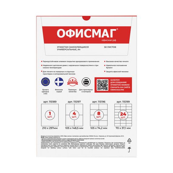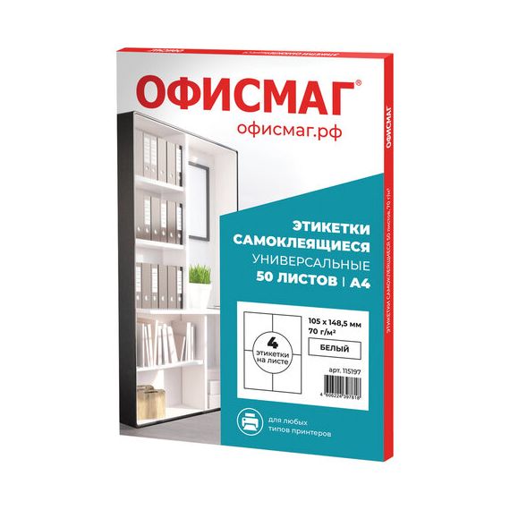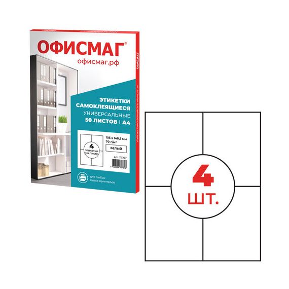 Этикетка самоклеящаяся 105х148,5 мм, 4 этикетки, белая 70 г/м2, 50 листов, ОФИСМАГ, сырье Финляндия, 115197