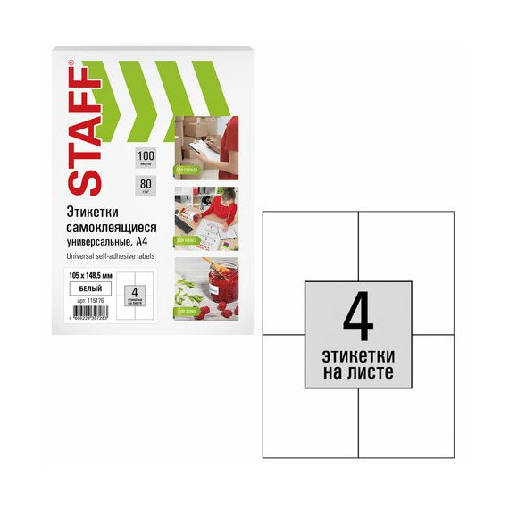 Этикетка самоклеящаяся 105х148,5 мм, 4 этикетки, белая, 80 г/м2, 100 листов, STAFF, 115176