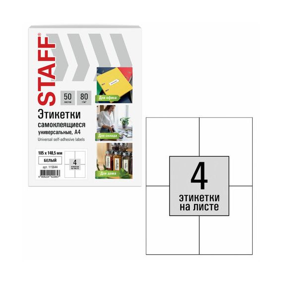 Этикетка самоклеящаяся 105х148,5 мм, 4 этикетки, белая, 80 г/м2, 50 листов, STAFF BASIC, 115644