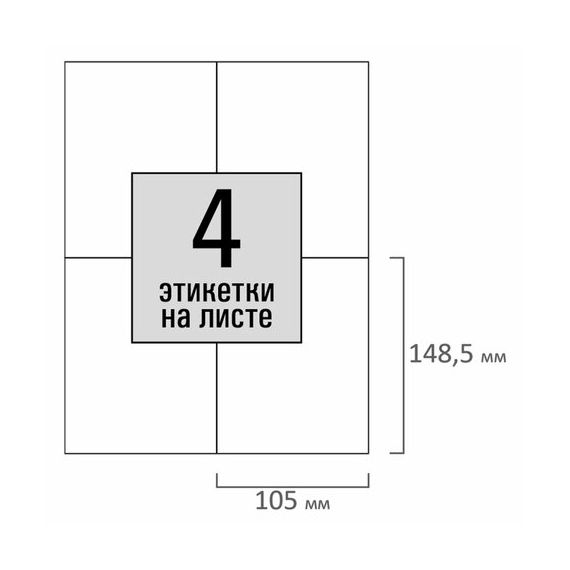 Изготовлены из самоклеящейся матовой бумаги плотностью 80 г/м2. Надежно приклеиваются к поверхности любой формы и материала. Картонная упаковка содержит 50 листов формата А4, на каждом листе – 4 этикетки размером 105х148,5 мм.