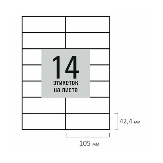 Изготовлены из самоклеящейся матовой бумаги плотностью 80 г/м2. Надежно приклеиваются к поверхности любой формы и материала. Картонная упаковка содержит 50 листов формата А4, на каждом листе – 14 этикеток размером 105х42,4 мм.