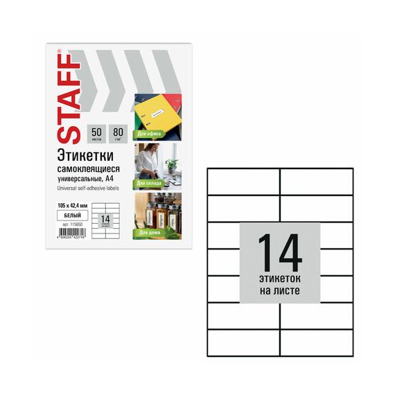 Этикетка самоклеящаяся 105х42,4 мм, 14 этикеток, белая, 80 г/м2, 50 листов, STAFF BASIC, 115650