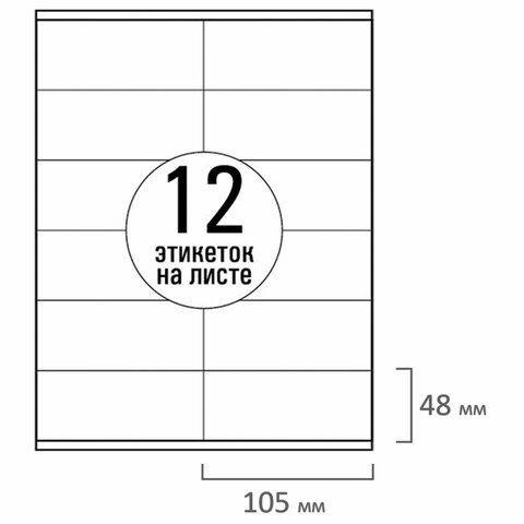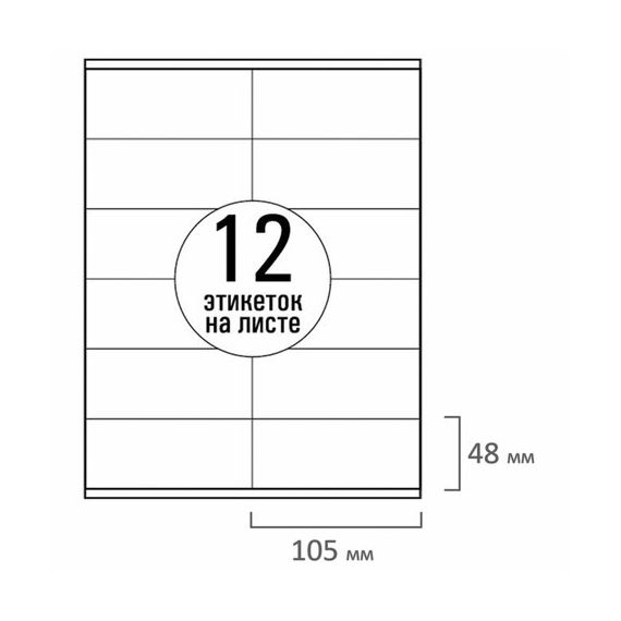 Изготовлены из матовой бумаги белого цвета плотностью 70 г/м2. Картонная упаковка содержит 50 листов формата А4, на каждом листе – двенадцать этикеток размером 105х48 мм.