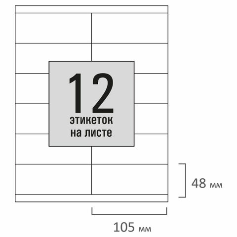 Изготовлены из самоклеящейся матовой бумаги плотностью 80 г/м2. Надежно приклеиваются к поверхности любой формы и материала. Картонная упаковка содержит 50 листов формата А4, на каждом листе – 12 этикеток размером 105х48 мм.