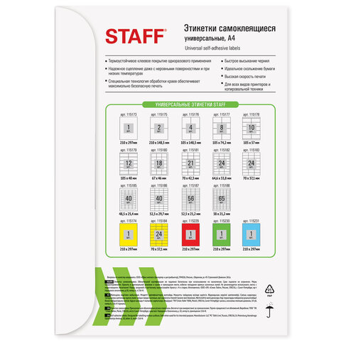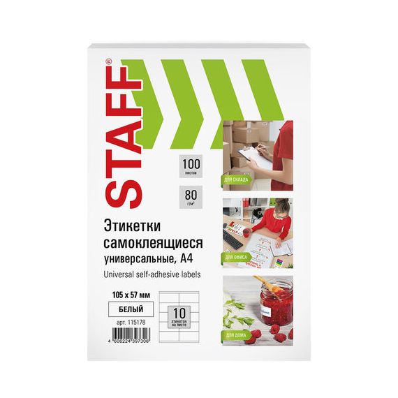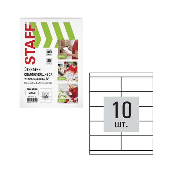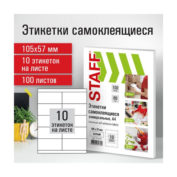 Этикетка самоклеящаяся 105х57 мм, 10 этикеток, белая, 80 г/м2, 100 листов, STAFF, 115178