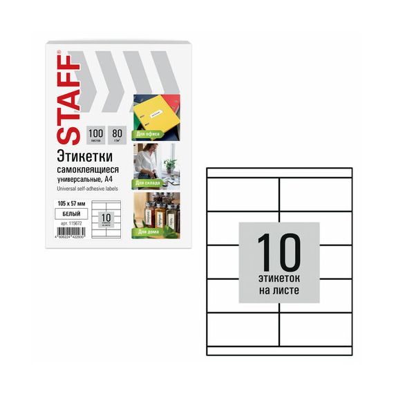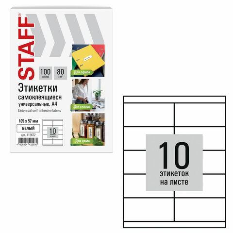 Этикетка самоклеящаяся 105х57 мм, 10 этикеток, белая, 80 г/м2, 100 листов, STAFF BASIC, 115672