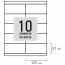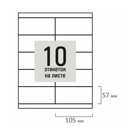 Изготовлены из самоклеящейся матовой бумаги плотностью 80 г/м2. Надежно приклеиваются к поверхности любой формы и материала. Картонная упаковка содержит 100 листов формата А4, на каждом листе – 10 этикеток размером 105х57 мм.