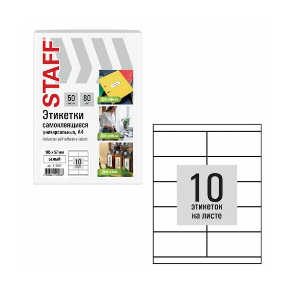 Этикетка самоклеящаяся 105х57 мм, 10 этикеток, белая, 80 г/м2, 50 листов, STAFF BASIC, 115647
