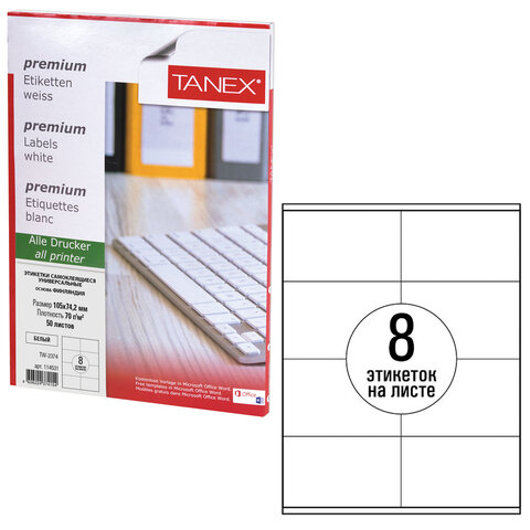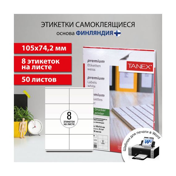 Этикетка самоклеящаяся 105х74,2 мм, 8 этикеток, белая, 70 г/м2, 50 листов, TANEX, сырье Финляндия, 114531, TW-2374