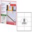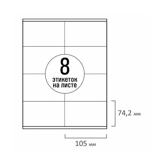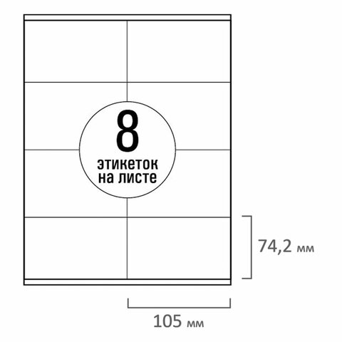 Изготовлены из матовой бумаги белого цвета плотностью 70 г/м2. Картонная упаковка содержит 50 листов формата А4, на каждом листе – восемь этикеток размером 105х74,2 мм.