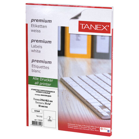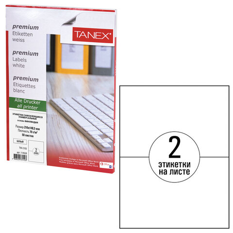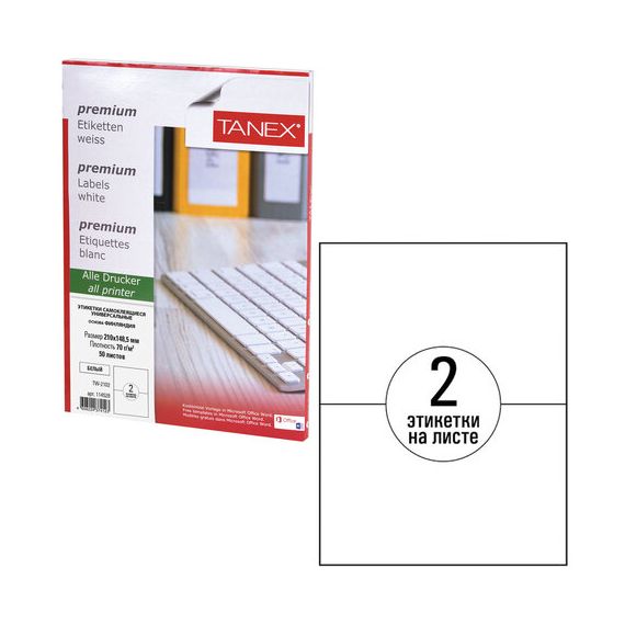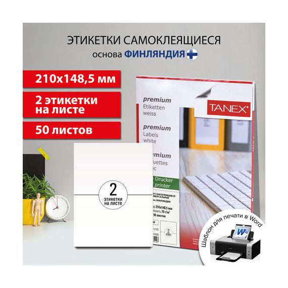 Этикетка самоклеящаяся 210х148,5 мм, 2 этикетки, белая, 70 г/м2, 50 листов, TANEX, сырье Финляндия, 114528, TW-2102