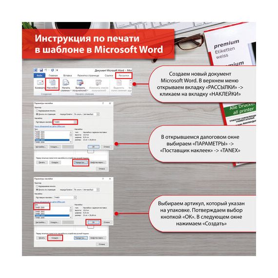 Для оформления и печати этикеток откройте текстовый редактор Word, выберите вкладку "Рассылки", затем "Наклейки", далее "Параметры", из раскрывающегося списка поставщиков выберите "TANEX", тип – TANEX 2102. Нажмите кнопку "Создать".