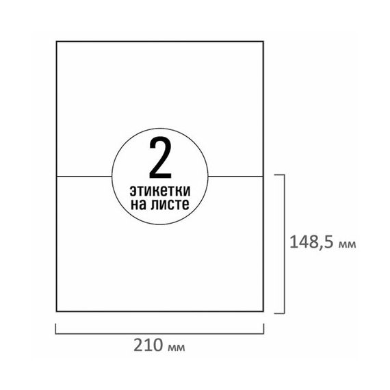 Изготовлены из матовой бумаги белого цвета плотностью 70 г/м2. Картонная упаковка содержит 50 листов формата А4, на каждом листе две этикетки размером 210х148,5 мм.