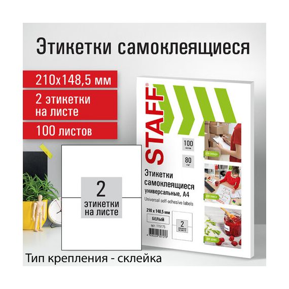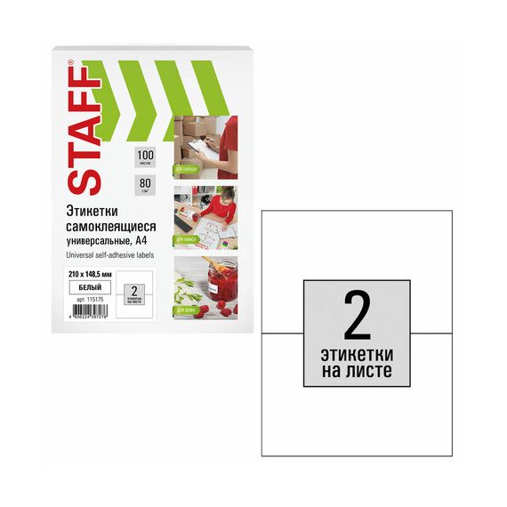 Этикетка самоклеящаяся 210х148,5 мм, 2 этикетки, белая, 80 г/м2, 100 листов, STAFF, 115175