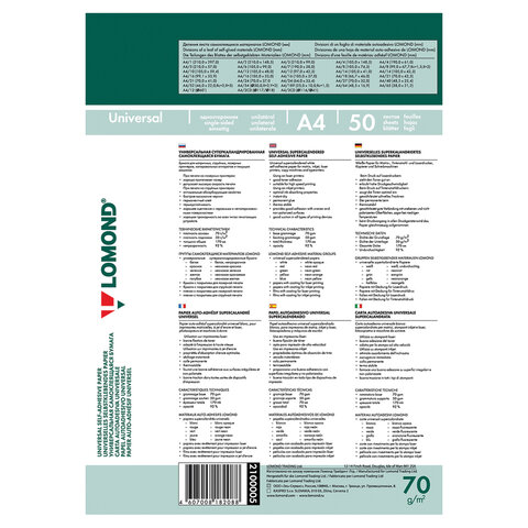Бумага LOMOND А4 самоклеющаяся – это бумага формата А4 на клеевой основе универсального назначения. Бумага подходит для печати на струйных, матричных, лазерных принтерах, копировальных аппаратах и служит для создания наклеек, этикеток, лейблов и других целей.