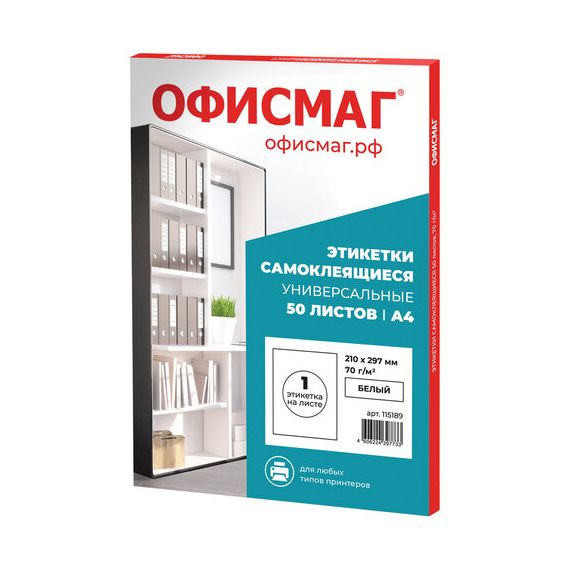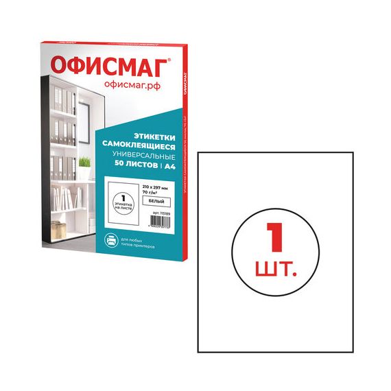 Этикетка самоклеящаяся 210х297 мм, 1 этикетка, белая, 70 г/м2, 50 листов, ОФИСМАГ, сырье Финляндия, 115189