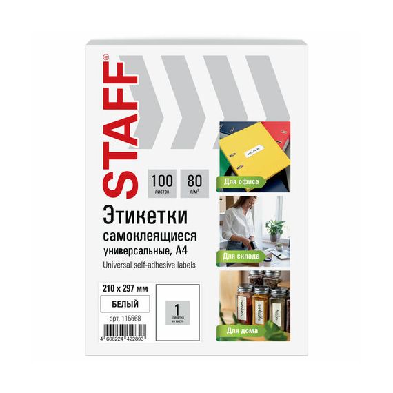Этикетка самоклеящаяся 210х297 мм, 1 этикетка, белая, 80 г/м2, 100 листов, STAFF BASIC, 115668