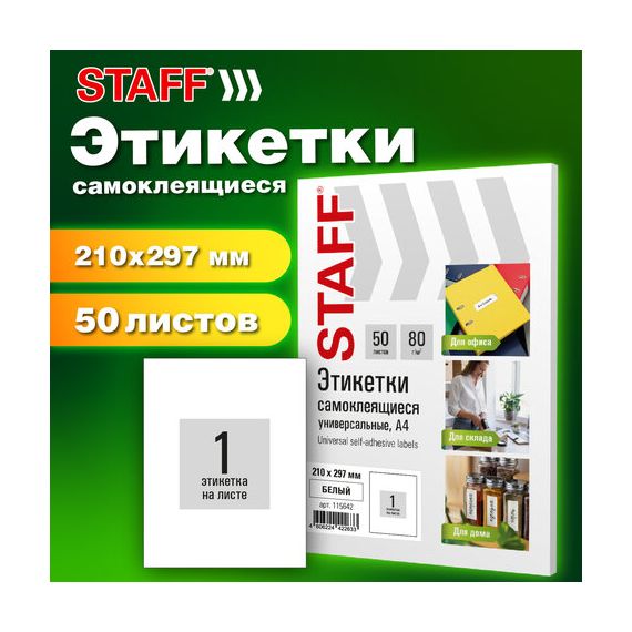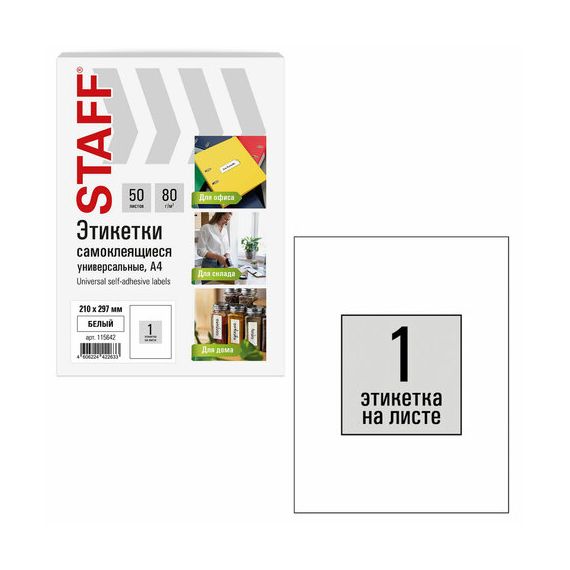Этикетка самоклеящаяся 210х297 мм, 1 этикетка, белая, 80 г/м2, 50 листов, STAFF BASIC, 115642