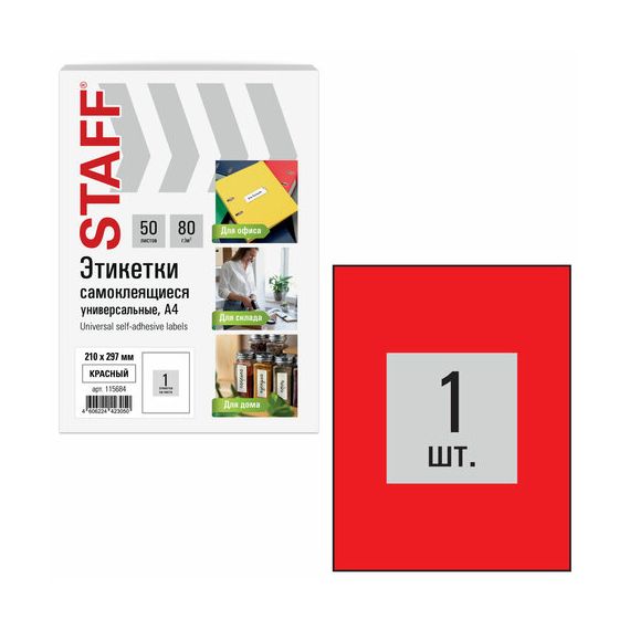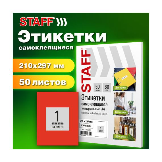 Этикетка самоклеящаяся 210х297 мм, 1 этикетка, красная, 80 г/м2, 50 листов, STAFF BASIC, 115684