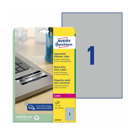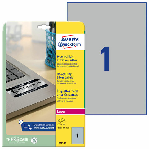 Этикетка самоклеящаяся 210x297 мм, 1 этикетка, полиэстер, серебро, 20 листов, Avery Zweckform, L6013-20