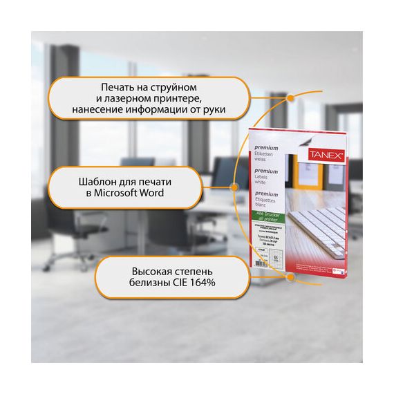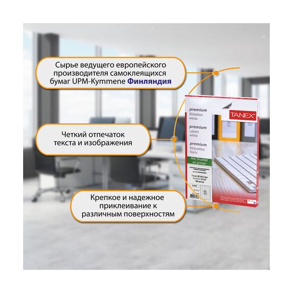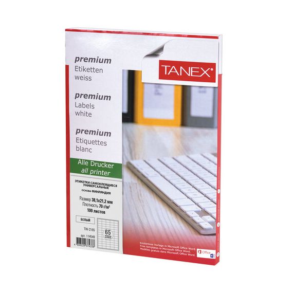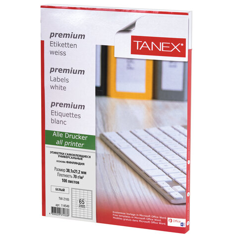 Этикетка самоклеящаяся 38,1х21,2 мм, 65 этикеток, белая, 70 г/м2, 100 листов, TANEX, сырье Финляндия, 114549, TW-2165