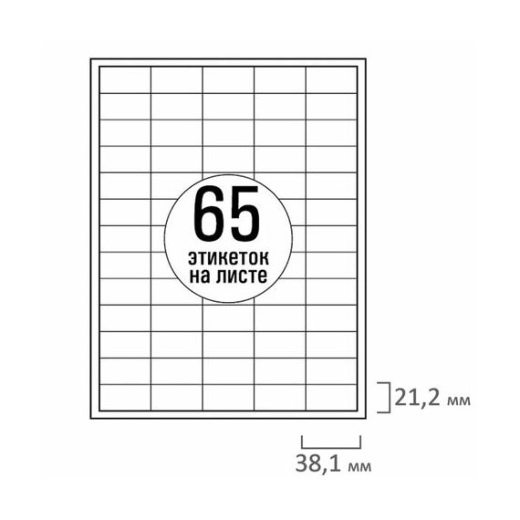 Изготовлены из матовой бумаги белого цвета плотностью 70 г/м2. Экономичная картонная упаковка содержит 100 листов формата А4, на каждом листе – шестьдесят пять этикеток размером 38,1х21,2 мм.