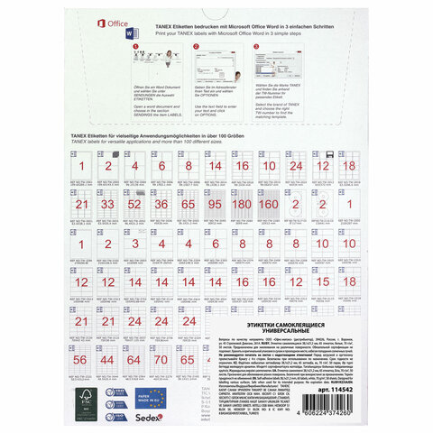 Для оформления и печати этикеток откройте текстовый редактор Word, выберите вкладку "Рассылки", затем "Наклейки", далее "Параметры", из раскрывающегося списка поставщиков выберите "TANEX", тип – TANEX 2165. Нажмите кнопку "Создать".
