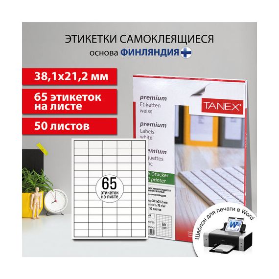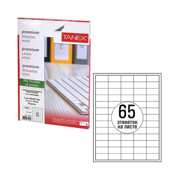 Этикетка самоклеящаяся 38,1х21,2 мм, 65 этикеток, белая, 70г/м2, 50 листов, TANEX, сырье Финляндия, 114542, TW-2165