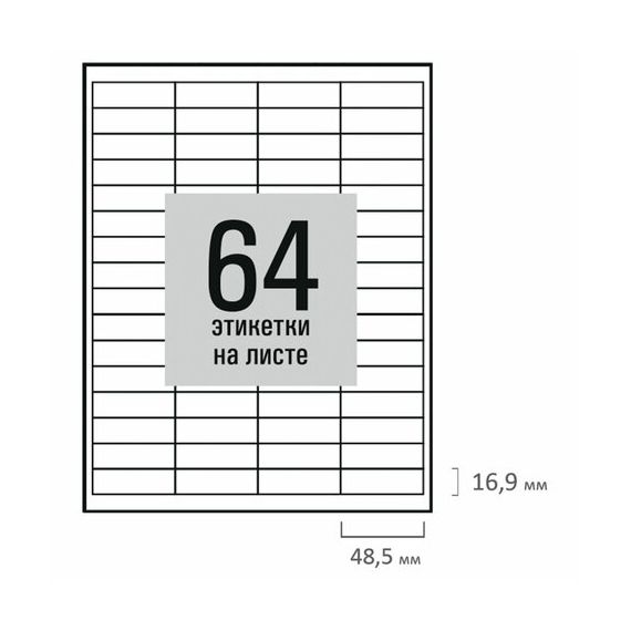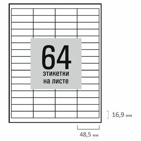 Изготовлены из самоклеящейся матовой бумаги плотностью 80 г/м2. Надежно приклеиваются к поверхности любой формы и материала. Картонная упаковка содержит 50 листов формата А4, на каждом листе – 64 этикетки размером 48,5х16,9 мм.