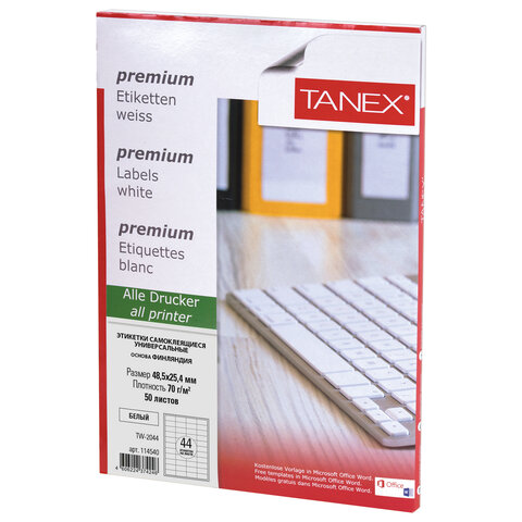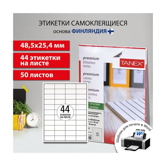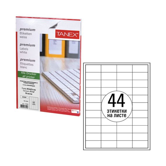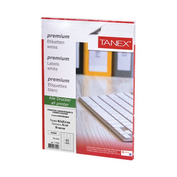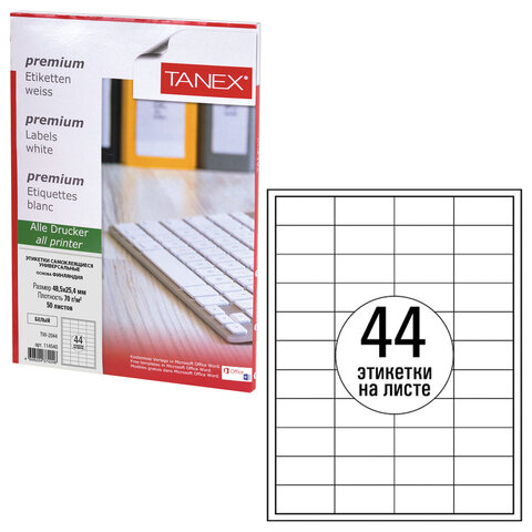 Этикетка самоклеящаяся 48,5х25,4 мм, 44 этикетки, белая, 70 г/м2, 50 листов, TANEX, сырье Финляндия, 114540, TW-2044