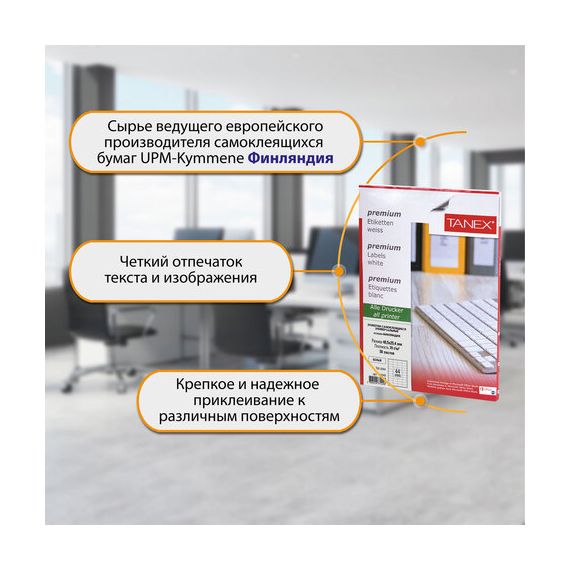 Изготовлены из матовой бумаги белого цвета плотностью 70 г/м2. Картонная упаковка содержит 50 листов формата А4, на каждом листе – сорок четыре этикетки размером 48,5х25,4 мм.