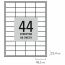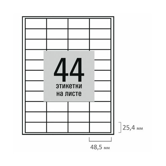 Изготовлены из самоклеящейся матовой бумаги плотностью 80 г/м2. Надежно приклеиваются к поверхности любой формы и материала. Картонная упаковка содержит 50 листов формата А4, на каждом листе – 44 этикетки размером 48,5х25,4 мм.