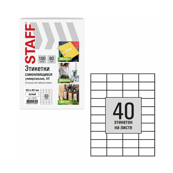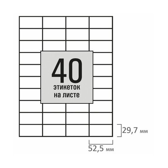 Изготовлены из самоклеящейся матовой бумаги плотностью 80 г/м2. Надежно приклеиваются к поверхности любой формы и материала. Картонная упаковка содержит 100 листов формата А4, на каждом листе – 40 этикеток размером 52,5х29,7 мм.