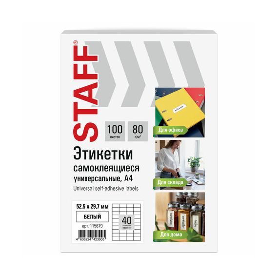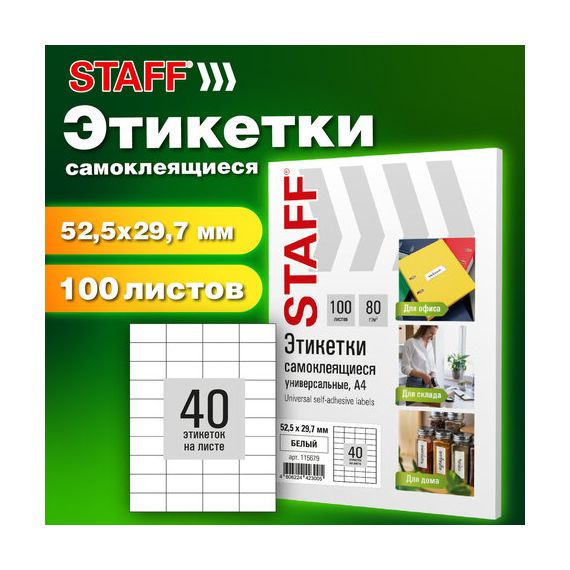 Этикетка самоклеящаяся 52,5х29,7 мм, 40 этикеток, белая, 80 г/м2, 100 листов, STAFF BASIC, 115679