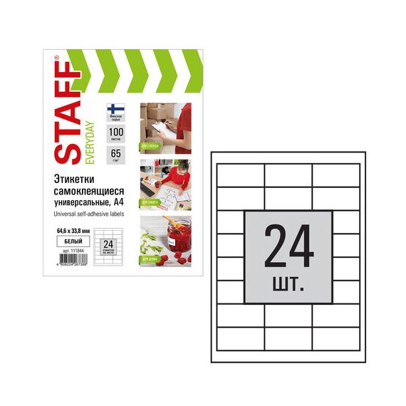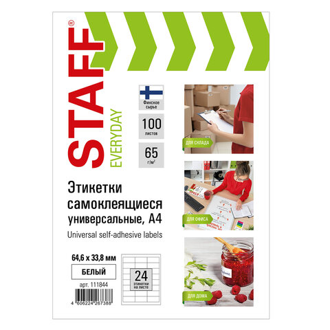 Этикетка самоклеящаяся 64,6х33,8 мм, 24 этикетки 65 г/м2, 100 л., STAFF "EVERYDAY" (сырье Финляндия), 111844