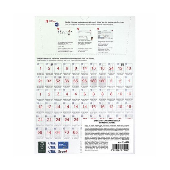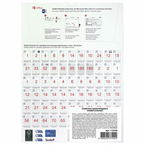 Для оформления и печати этикеток откройте текстовый редактор Word, выберите вкладку "Рассылки",затем "Наклейки", далее "Параметры", из раскрывающегося списка поставщиков выберите "TANEX", тип – TANEX 2533. Нажмите кнопку "Создать".