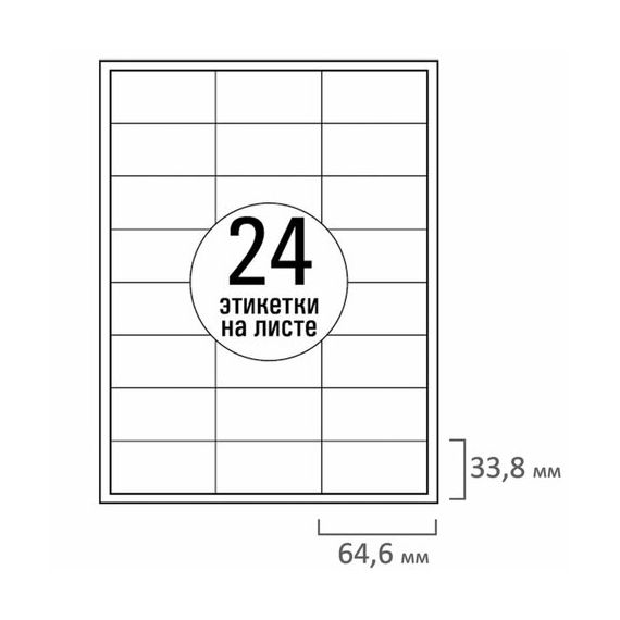 Изготовлены из матовой бумаги белого цвета плотностью 70 г/м2. Картонная упаковка содержит 50 листов формата А4, на каждом листе – двадцать четыре этикетки размером 64,6х33,8 мм.