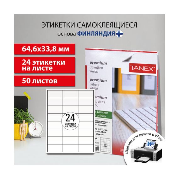 Этикетка самоклеящаяся 64,6х33,8 мм, 24 этикетки, белая 70 г/м2, 50 листов, TANEX, сырье Финляндия, 114538, TW-2533
