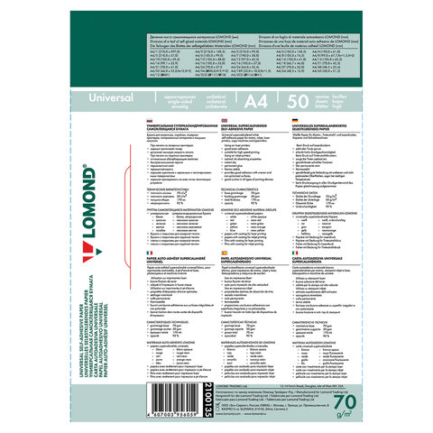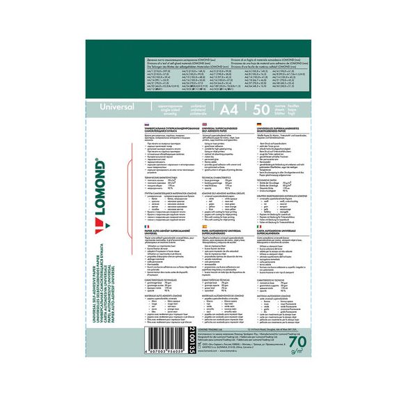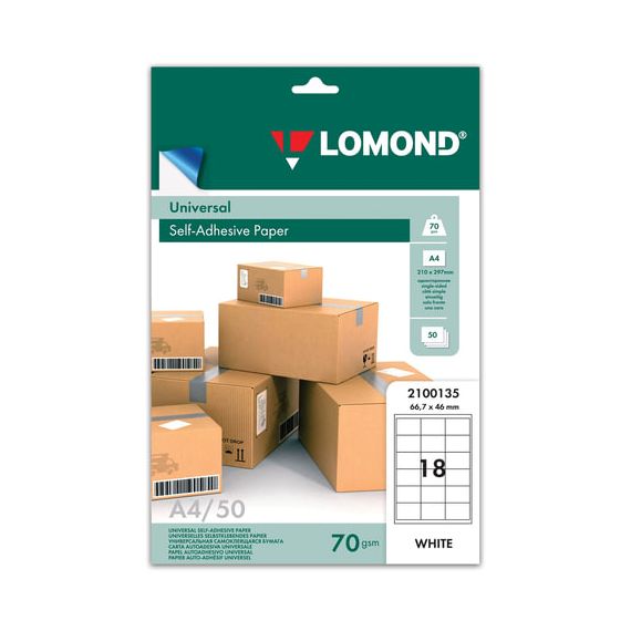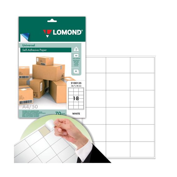 Этикетка самоклеящаяся 66,7х46 мм, 18 этикеток, белая, 70 г/м2, 50 листов, LOMOND, 2100135